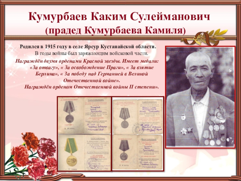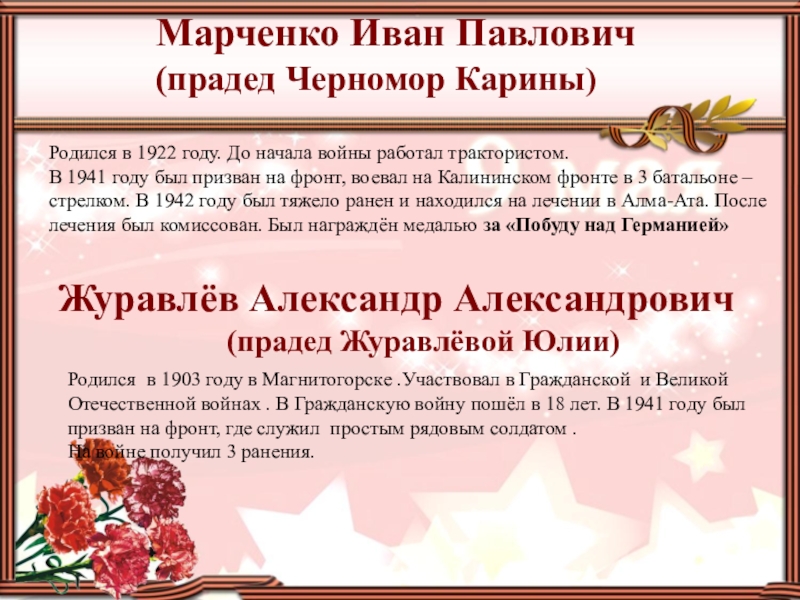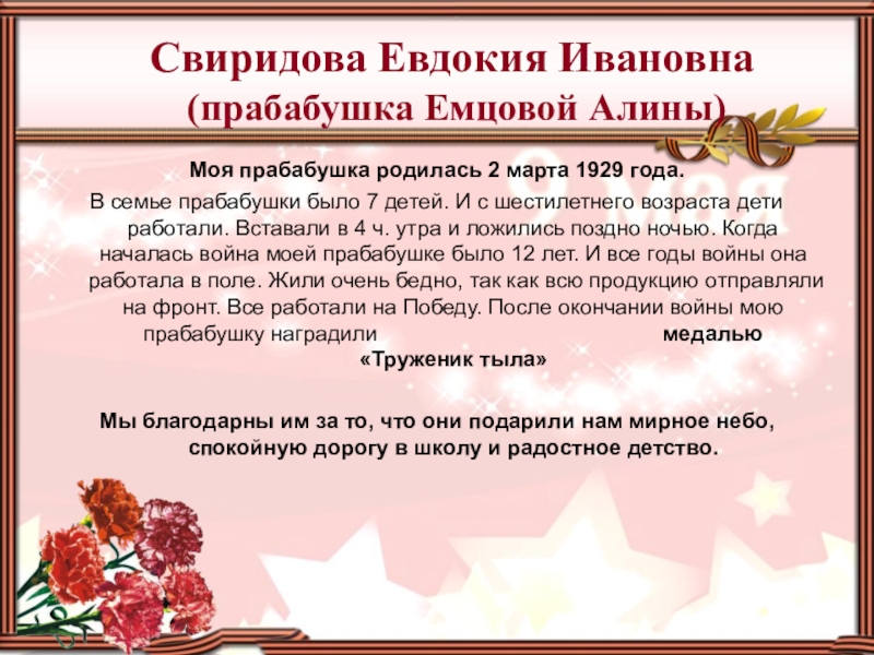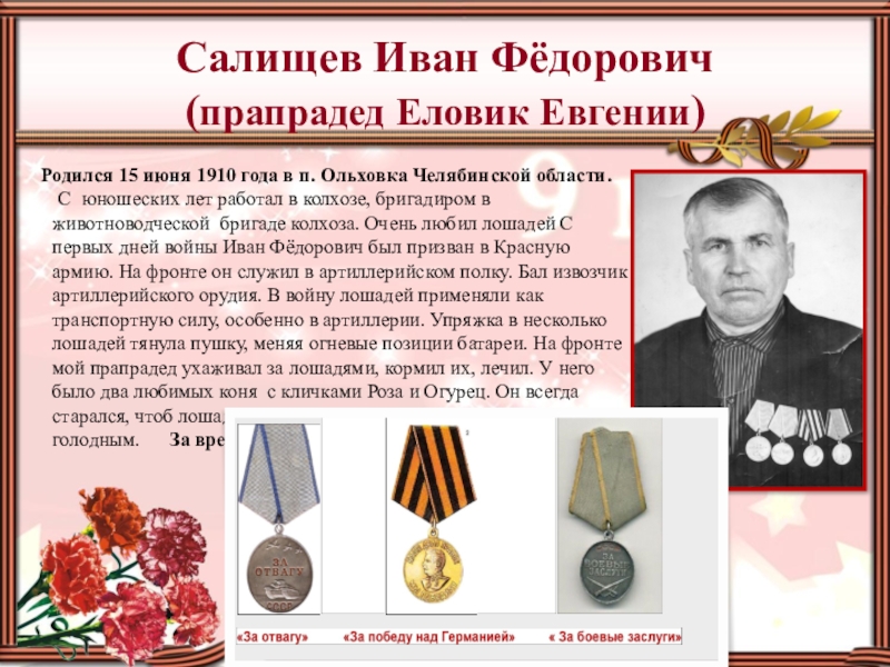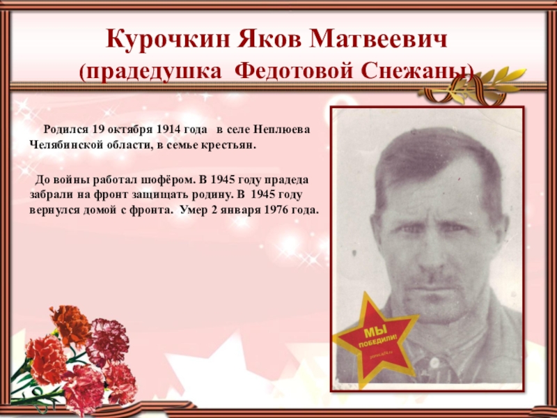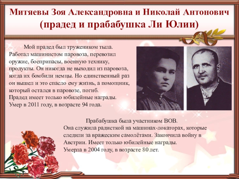 Мой прадед был тружеником тыла. Работал машинистом паровоза, перевозил оружие, боеприпасы, военную технику, продукты. Он никогда не выходил из паровоза, когда их бомбили немцы. Но единственный раз он вышел и это спасло ему жизнь, а помощник, который остался в паровозе, погиб. Прадед имеет только юбилейные награды. Умер в 2011 году, в возрасте 94 года.
