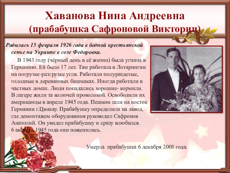 Прабабушка была участником ВОВ. Она служила радисткой на машинах-локаторах, которые следили за вражеским самолётами. Закончила войну в Австрии. Имеет только юбилейные награды. Умерла в 2004 году, в возрасте 80 лет.