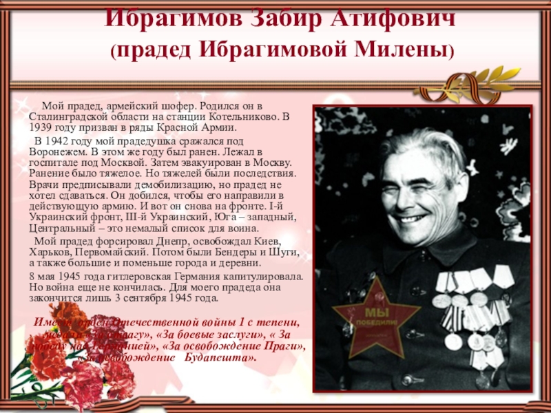 В 1942 году мой прадедушка сражался под Воронежем. В этом же году был ранен. Лежал в госпитале под Москвой. Затем эвакуирован в Москву. Ранение было тяжелое. Но тяжелей были последствия. Врачи предписывали демобилизацию, но прадед не хотел сдаваться. Он добился, чтобы его направили в действующую армию. И вот он снова на фронте. I-й Украинский фронт, III-й Украинский, Юга – западный, Центральный – это немалый список для воина.