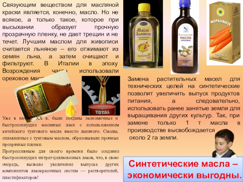 Уже в начале XX в. были созданы экономичные и быстросохнущие масляные лаки с использованием китайского тунгового масла вместо льняного. Смолы, сплавленные с тунговым маслом, образовывали прочные прозрачные пленки.