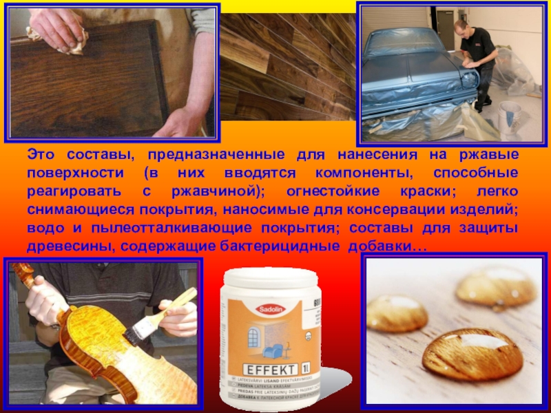Прогрессивным для своего времени было создание быстросохнущих нитрат-целлюлозных лаков, что, в свою очередь, вызвало увеличение выпуска других компонентов лакокрасочных систем — растворителей, пластификаторов!