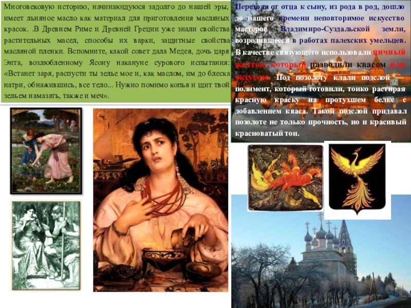 Переходя от отца к сыну, из рода в род, дошло до нашего времени неповторимое искусство мастеров Владимиро-Суздальской земли, возродившееся в работах палехских умельцев. В качестве связующего использовали яичный желток, который разводили квасом или уксусом. Под позолоту клали подслой — полимент, который готовили, тонко растирая красную краску на протухшем белке с добавлением кваса. Такой подслой придавал позолоте не только прочность, но и красивый красноватый тон.