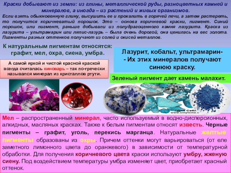 Краски добывают из земли: из глины, металлической руды, разноцветных камней и минералов, а иногда – из растений и живых организмов.