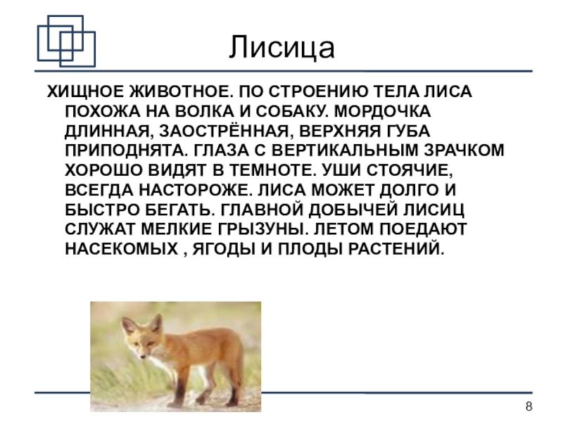 СОБАКУ. МОРДОЧКА ДЛИННАЯ, ЗАОСТРЁННАЯ, ВЕРХНЯЯ ГУБА ПРИПОДНЯТА. ГЛАЗА С ВЕРТИКАЛЬНЫМ ЗРАЧКОМ ХОРОШО ВИДЯТ В ТЕМНОТЕ. УШИ СТОЯЧИЕ, ВСЕГДА НАСТОРОЖЕ. ЛИСА МОЖЕТ ДОЛГО И БЫСТРО БЕГАТЬ. ГЛАВНОЙ ДОБЫЧЕЙ ЛИСИЦ СЛУЖАТ МЕЛКИЕ ГРЫЗУНЫ. ЛЕТОМ ПОЕДАЮТ НАСЕКОМЫХ , ЯГОДЫ И ПЛОДЫ РАСТЕНИЙ.