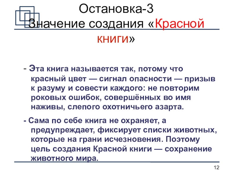 - Сама по себе книга не охраняет, а предупреждает, фиксирует списки животных, которые на грани исчезновения. Поэтому цель создания Красной книги — сохранение животного мира.