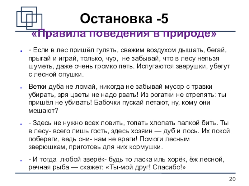 Ветки дуба не ломай, никогда не забывай мусор с травки убирать, зря цветы не надо рвать! Из рогатки не стрелять: ты пришёл не убивать! Бабочки пускай летают, ну, кому они мешают?