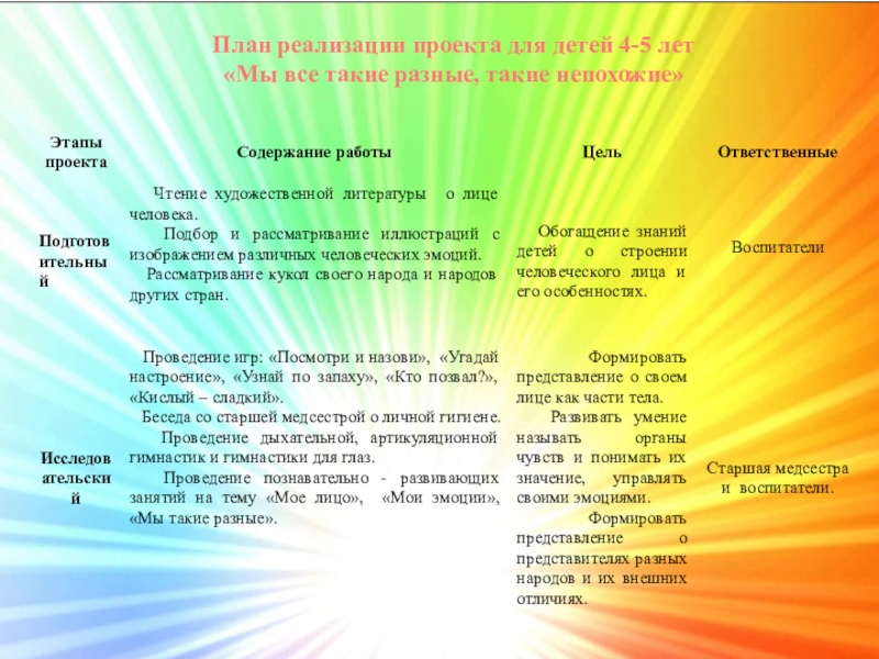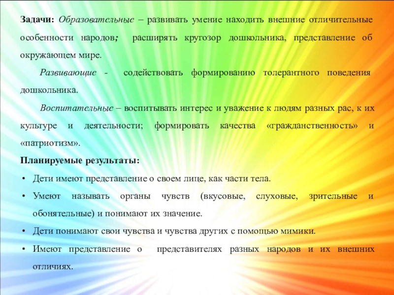 Цель: формирование основ толерантной культуры личности дошкольника, в рамках системной работы в ДОУ по средствам позитивного отношения к окружающему миру и культуре своего народа, народов других стран. Дать представление о представителях разных народов, их внешнем отличии.