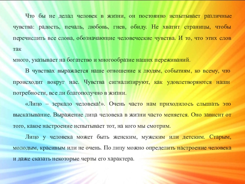 «Лицо – зеркало человека!». Очень часто нам приходилось слышать это высказывание. Выражение лица человека в жизни часто меняется. Оно зависит от того, какое настроение испытывает тот, на кого мы смотрим.