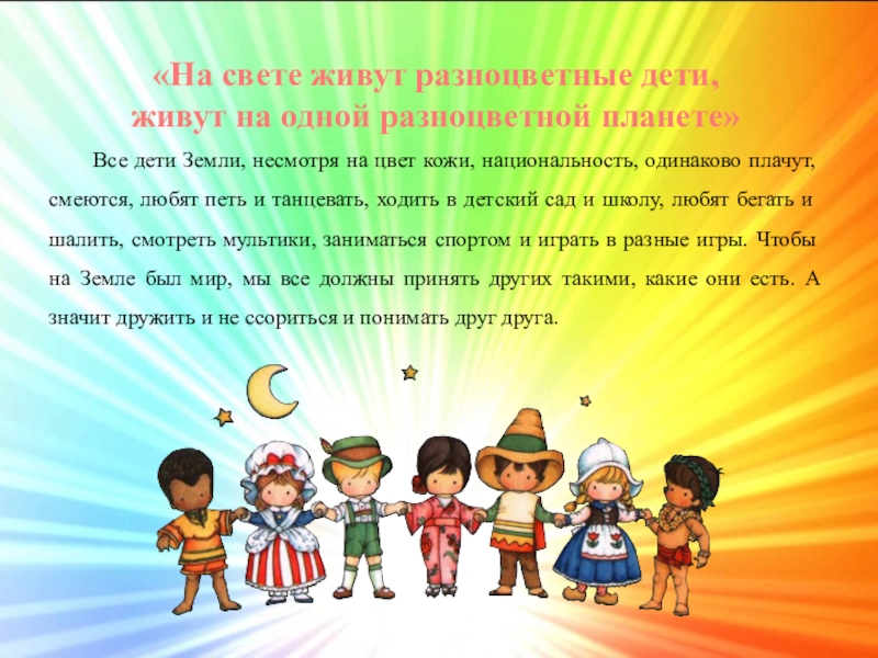 любят петь и танцевать, ходить в детский сад и школу, любят бегать и шалить, смотреть мультики, заниматься спортом и играть в разные игры. Чтобы на Земле был мир, мы все должны принять других такими, какие они есть. А значит дружить и не ссориться и понимать друг друга.