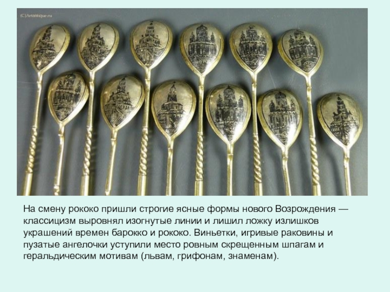 выровнял изогнутые линии и лишил ложку излишков украшений времен барокко и рококо. Виньетки, игривые раковины и пузатые ангелочки уступили место ровным скрещенным шпагам и геральдическим мотивам (львам, грифонам, знаменам).