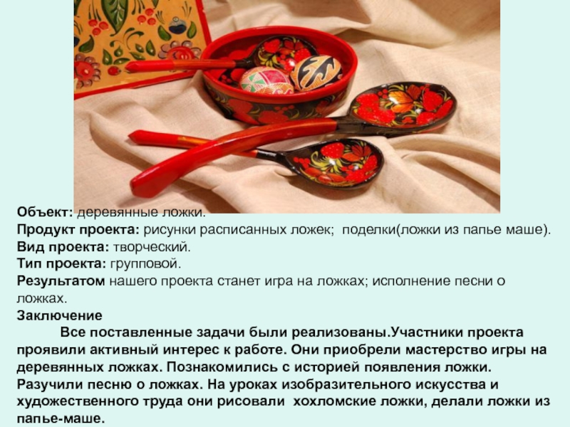 Все поставленные задачи были реализованы.Участники проекта проявили активный интерес к работе. Они приобрели мастерство игры на деревянных ложках. Познакомились с историей появления ложки. Разучили песню о ложках. На уроках изобразительного искусства и художественного труда они рисовали хохломские ложки, делали ложки из папье-маше.