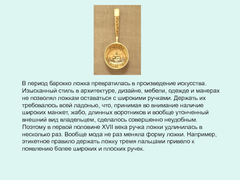 Слайд 7В период барокко ложка превратилась в произведение искусства. Изысканный стиль в
