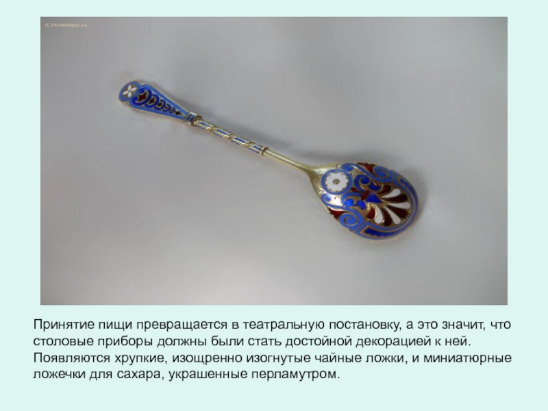 приборы должны были стать достойной декорацией к ней. Появляются хрупкие, изощренно изогнутые чайные ложки, и миниатюрные ложечки для сахара, украшенные перламутром.