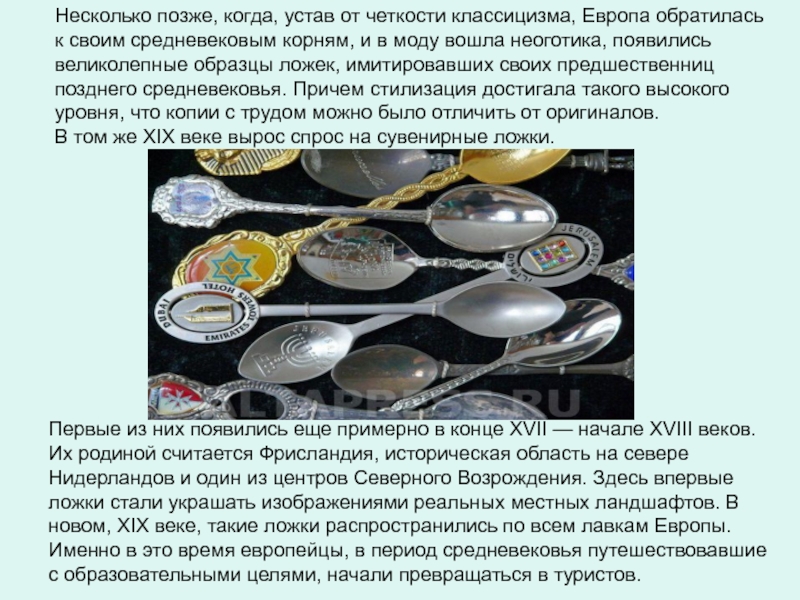 средневековым корням, и в моду вошла неоготика, появились великолепные образцы ложек, имитировавших своих предшественниц позднего средневековья. Причем стилизация достигала такого высокого уровня, что копии с трудом можно было отличить от оригиналов.