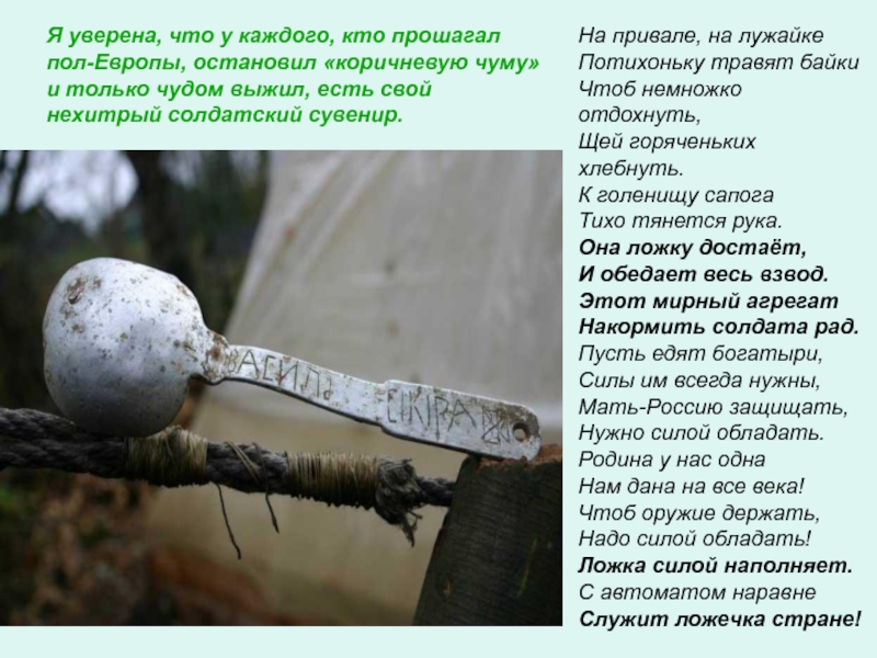 Я уверена, что у каждого, кто прошагал пол-Европы, остановил «коричневую чуму» и только чудом выжил, есть свой нехитрый солдатский сувенир.