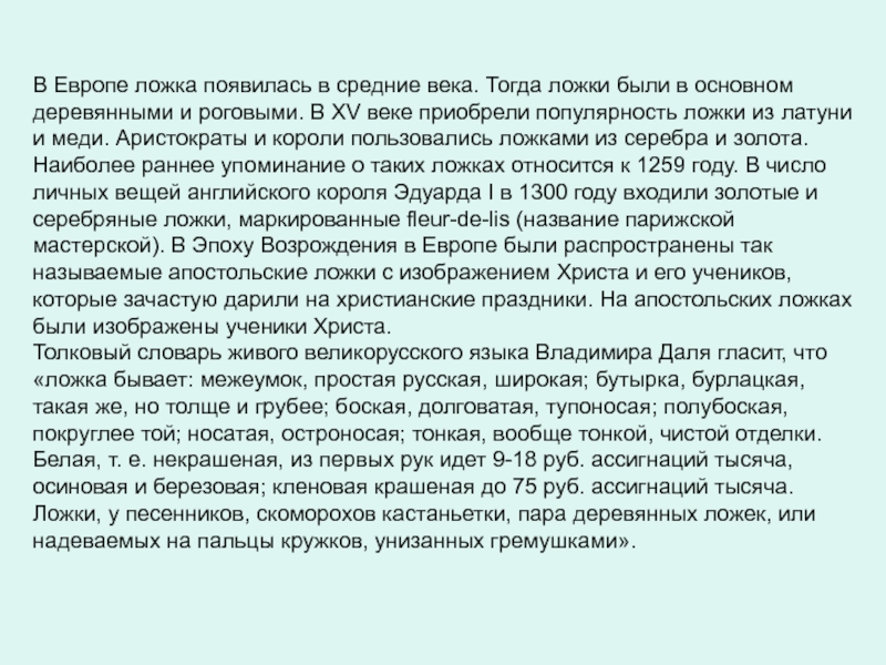 основном деревянными и роговыми. В XV веке приобрели популярность ложки из латуни и меди. Аристократы и короли пользовались ложками из серебра и золота. Наиболее раннее упоминание о таких ложках относится к 1259 году. В число личных вещей английского короля Эдуарда I в 1300 году входили золотые и серебряные ложки, маркированные fleur-de-lis (название парижской мастерской). В Эпоху Возрождения в Европе были распространены так называемые апостольские ложки с изображением Христа и его учеников, которые зачастую дарили на христианские праздники. На апостольских ложках были изображены ученики Христа.