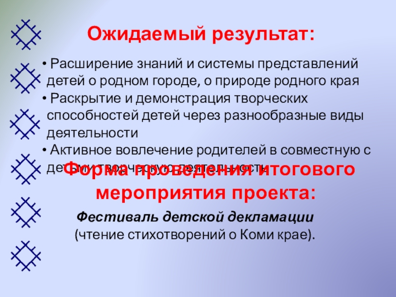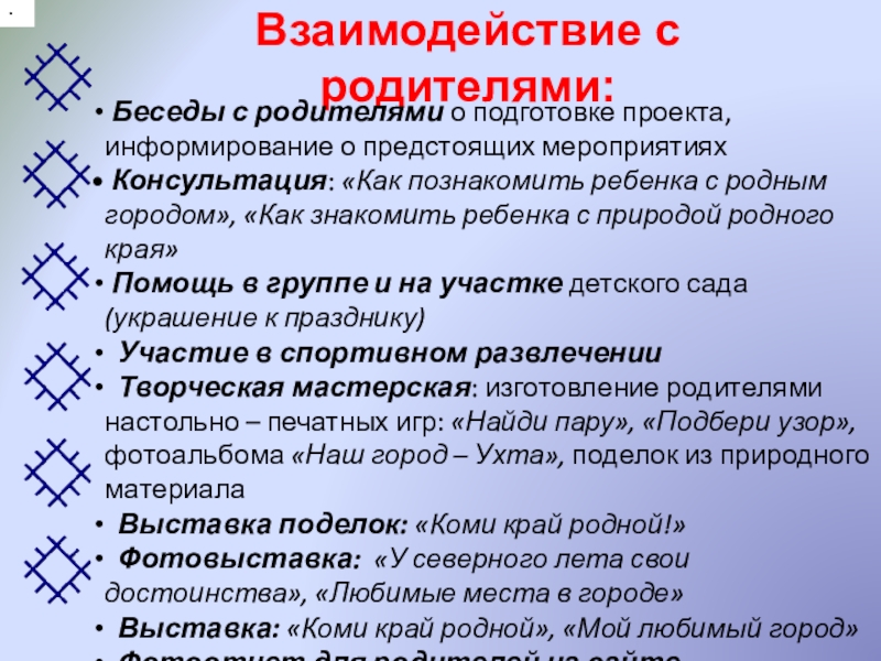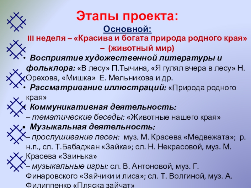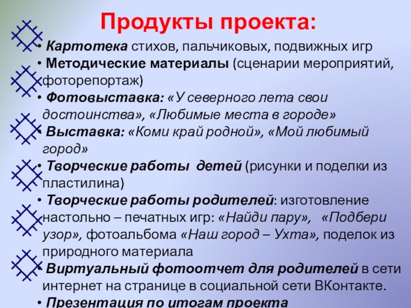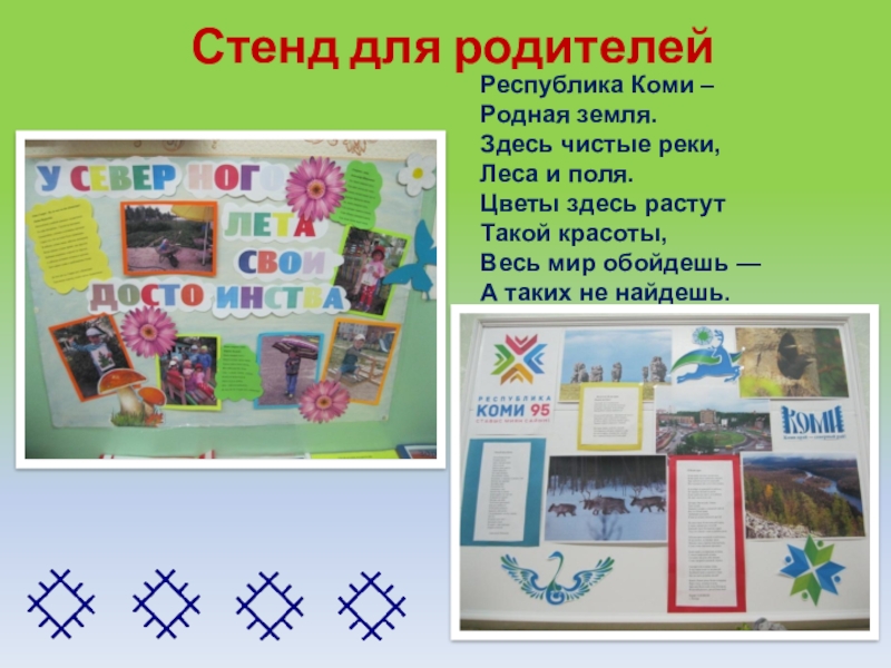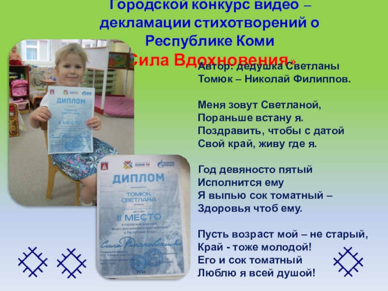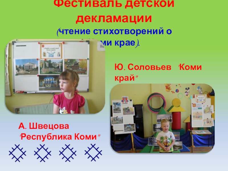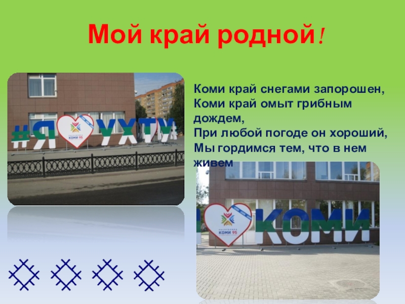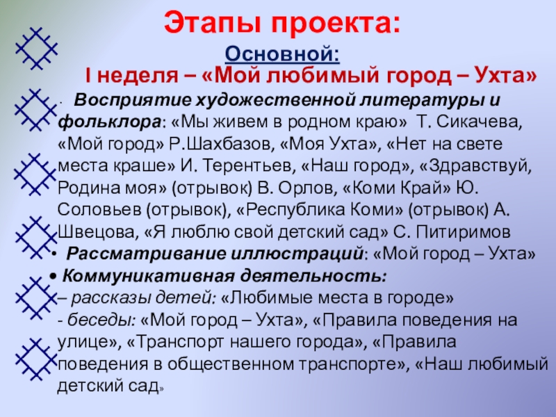 литературы и фольклора: «Мы живем в родном краю» Т. Сикачева, «Мой город» Р.Шахбазов, «Моя Ухта», «Нет на свете места краше» И. Терентьев, «Наш город», «Здравствуй, Родина моя» (отрывок) В. Орлов, «Коми Край» Ю. Соловьев (отрывок), «Республика Коми» (отрывок) А. Швецова, «Я люблю свой детский сад» С. Питиримов