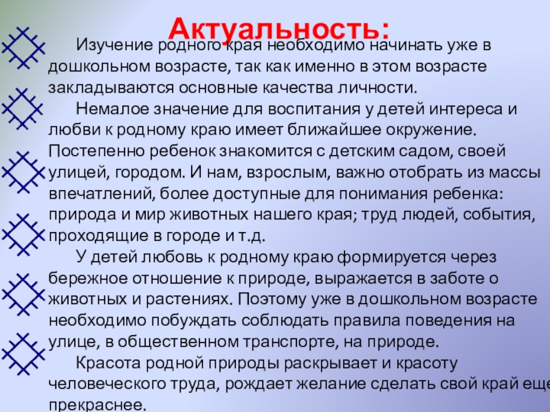 Изучение родного края необходимо начинать уже в дошкольном возрасте, так как