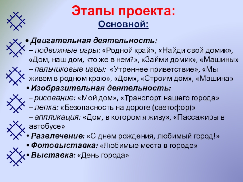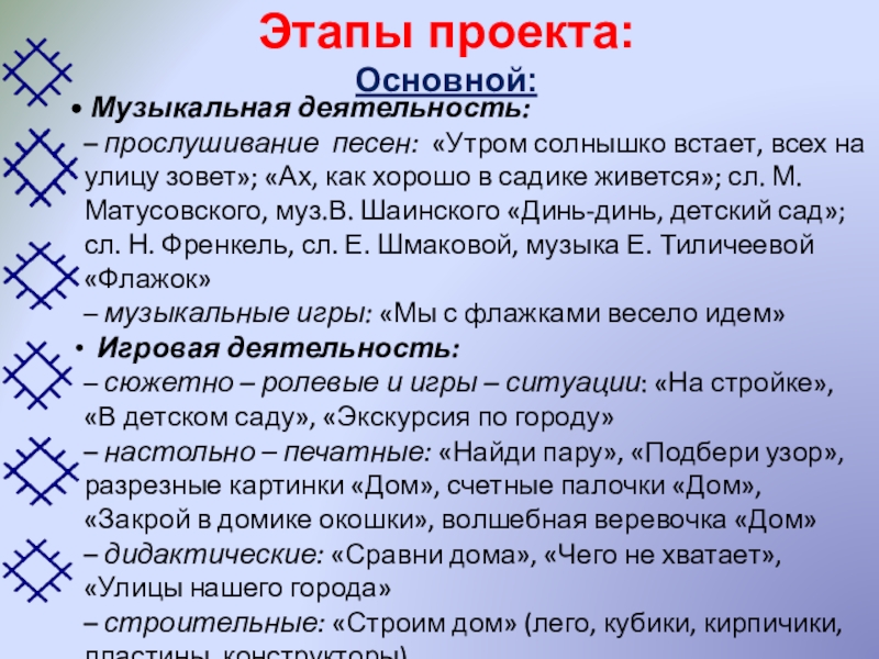 – сюжетно – ролевые и игры – ситуации: «На стройке», «В детском саду», «Экскурсия по городу»