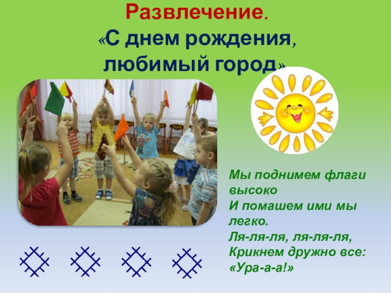 улицу зовет»; «Ах, как хорошо в садике живется»; сл. М. Матусовского, муз.В. Шаинского «Динь-динь, детский сад»; сл. Н. Френкель, сл. Е. Шмаковой, музыка Е. Тиличеевой «Флажок»