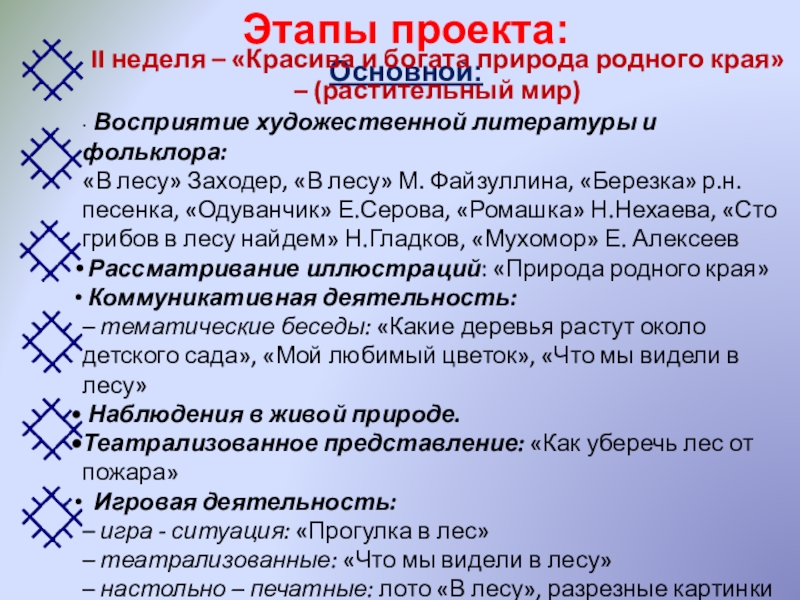 – тематические беседы: «Какие деревья растут около детского сада», «Мой любимый цветок», «Что мы видели в лесу»