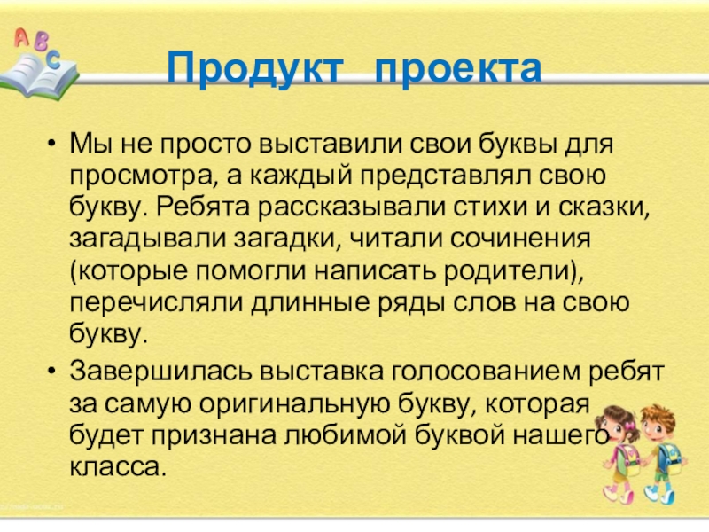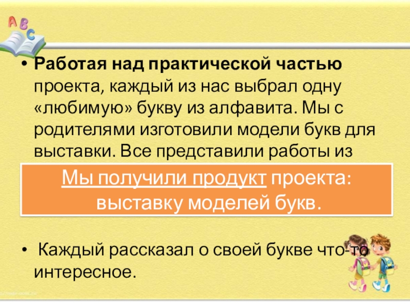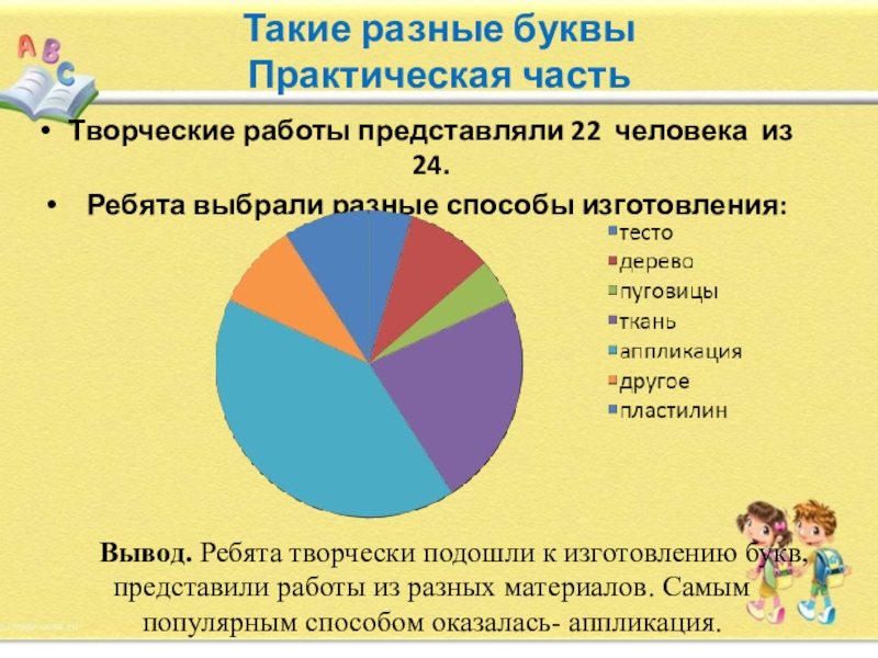 Вывод. Ребята творчески подошли к изготовлению букв, представили работы из разных материалов. Самым популярным способом оказалась- аппликация.