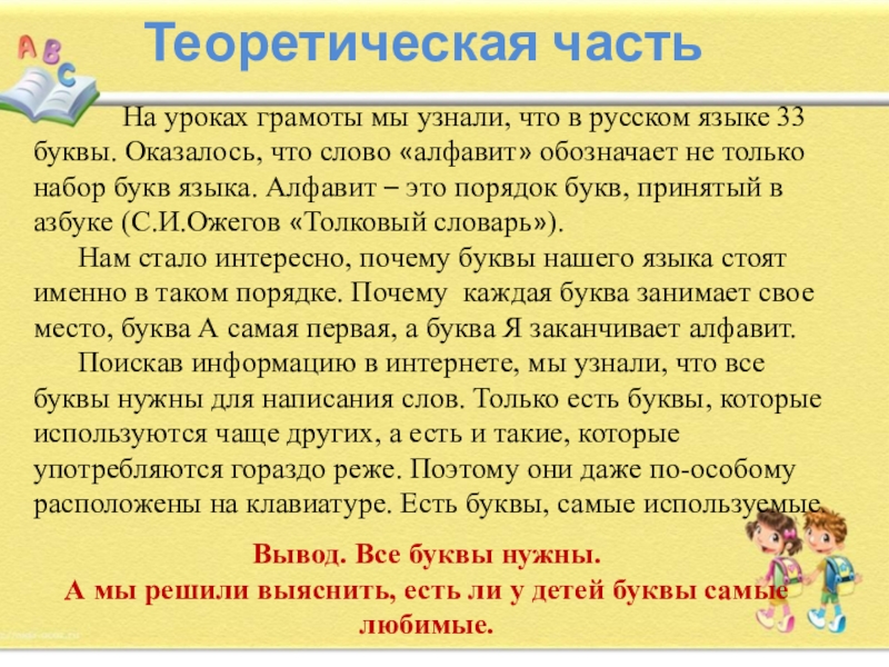 Работая над теоретической частью проекта, мы узнали, что каждая из 33 букв занимает свое место в русском алфавите и обязательно нужна для написания слов. Но оказалось, что