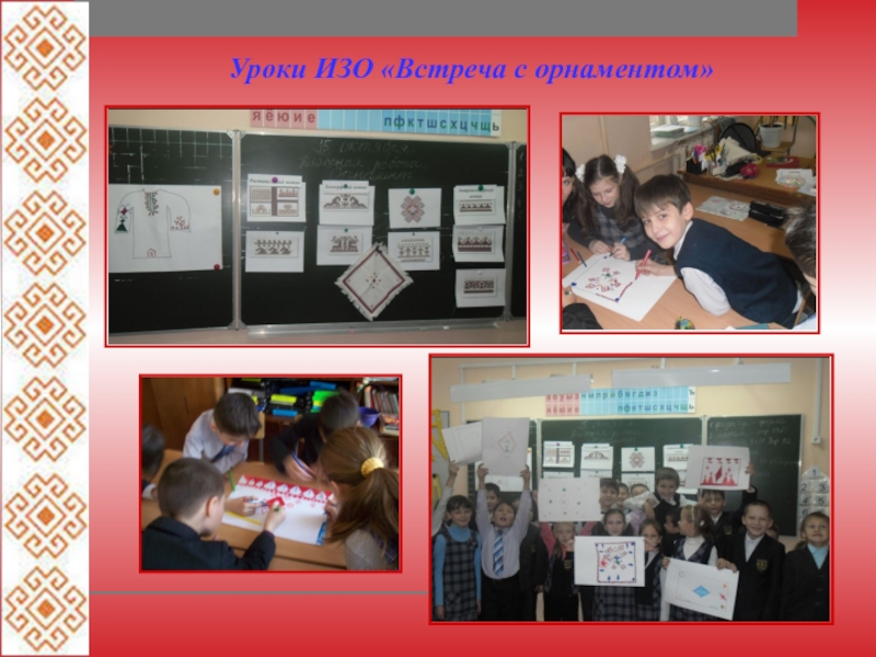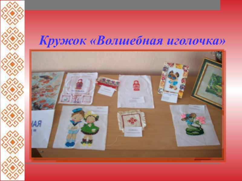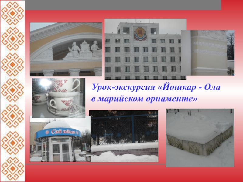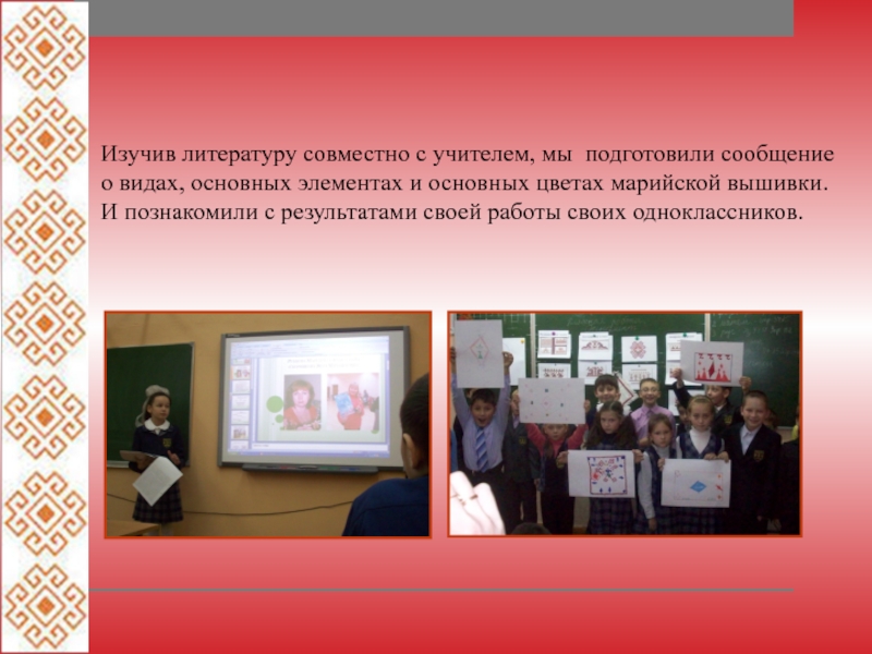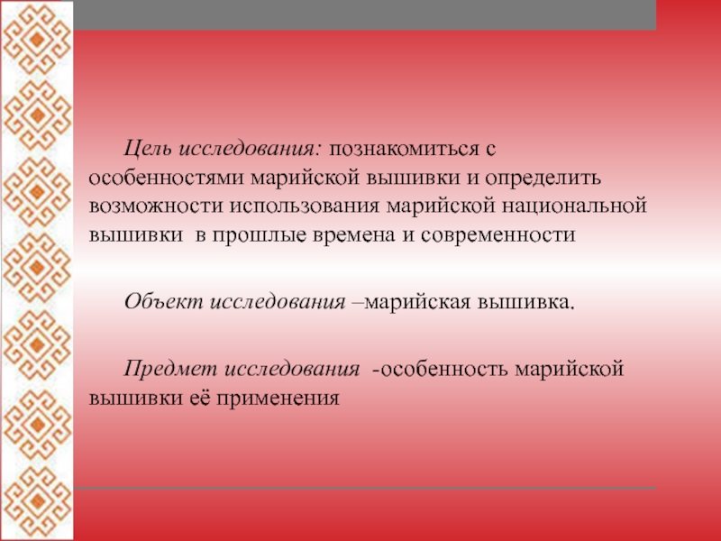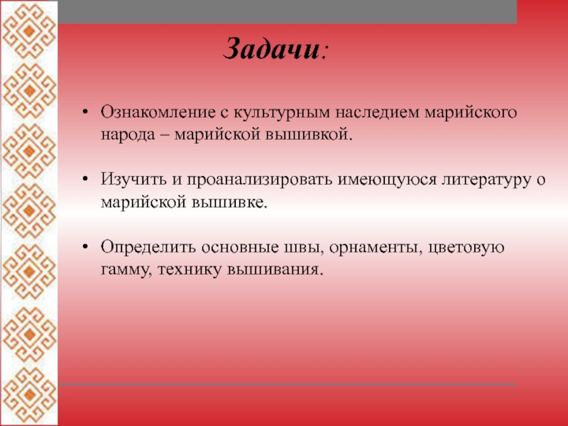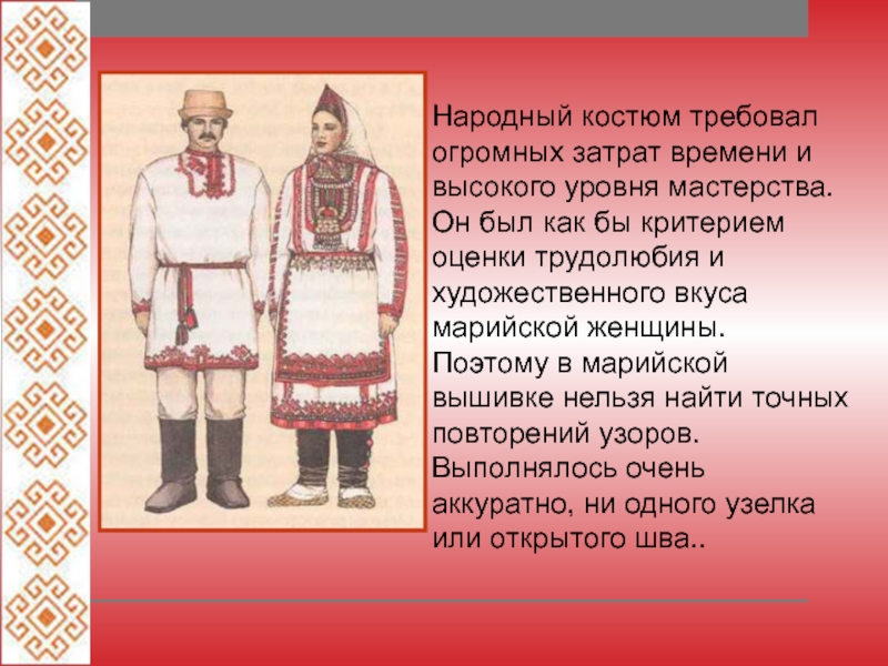 Марийской вышивки отличается большим разнообразием рисунков. Строится из прямых и ломаных линий в вертикальной и горизонтальной симметрии.