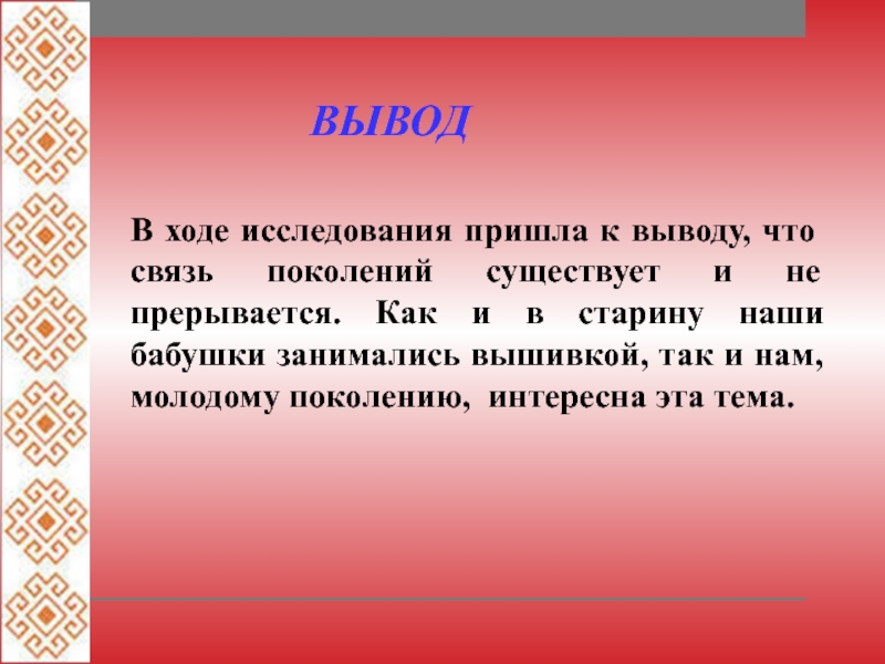 основной цвет – красный - означал цвет огня, солнца, дающих жизнь всему живому на земле Добавочные - зеленый, синий, черный, желтый, оранжевый – вводились небольшими линиями и пятнами в основной красный фон вышивки, оживляя ее.