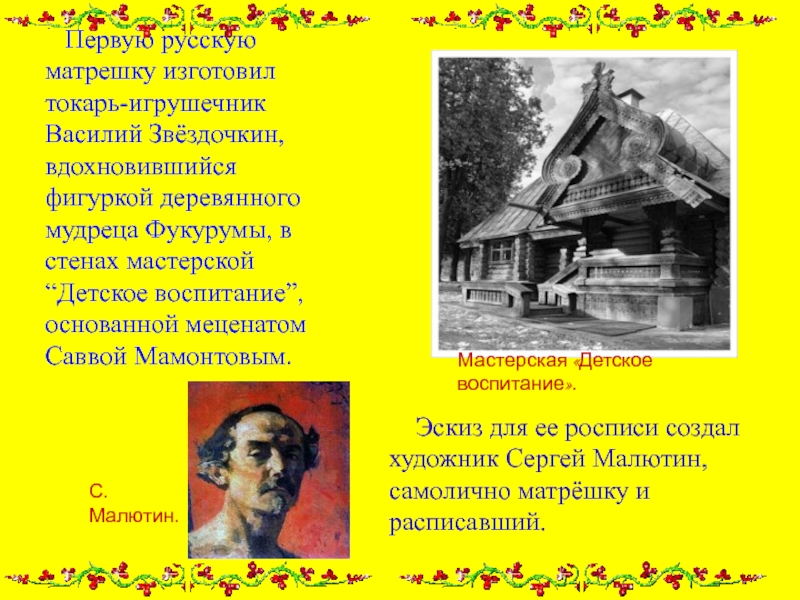 Эскиз для ее росписи создал художник Сергей Малютин, самолично матрёшку и расписавший.