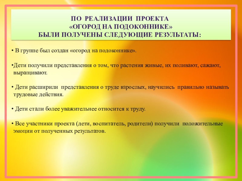 Все участники проекта (дети, воспитатель, родители) получат положительные эмоции от полученных результатов.
