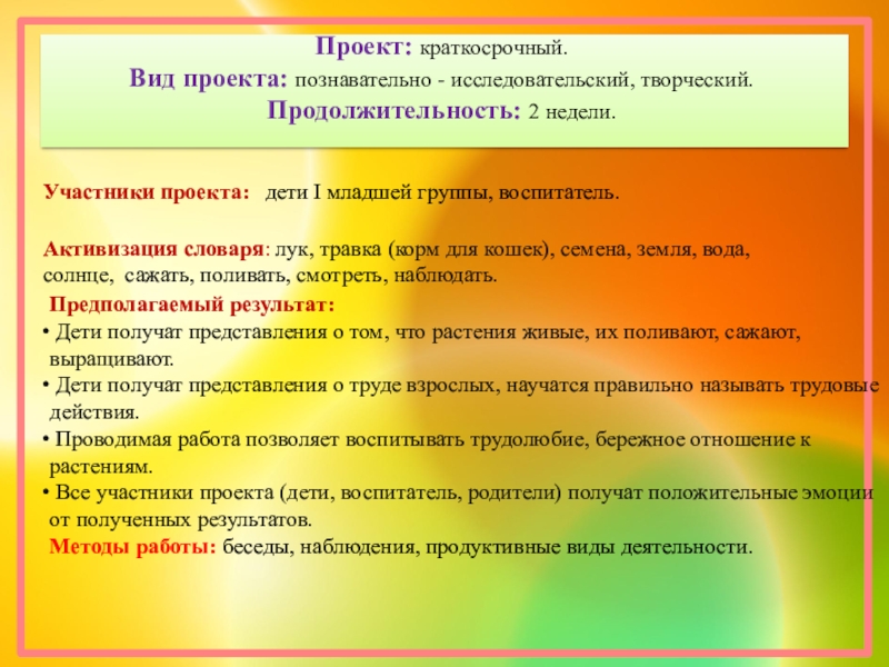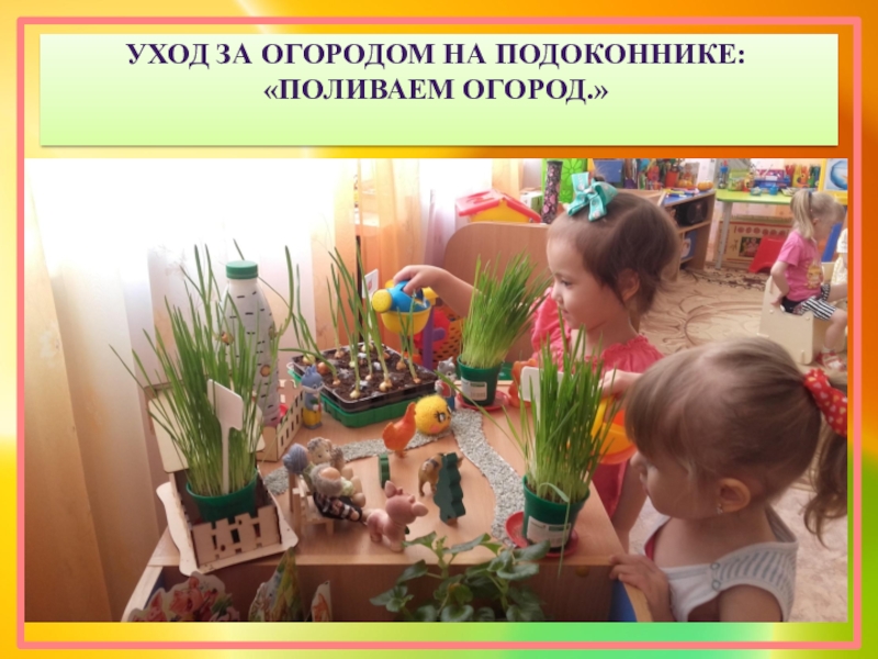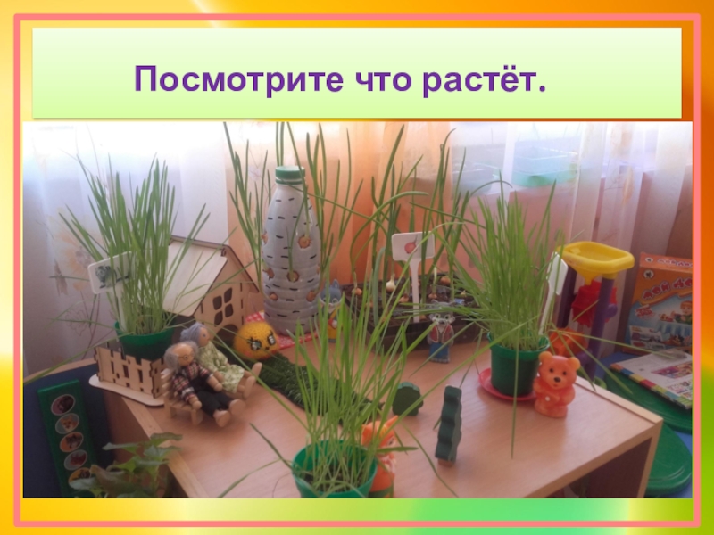 Активизация словаря: лук, травка (корм для кошек), семена, земля, вода, солнце, сажать, поливать, смотреть, наблюдать.