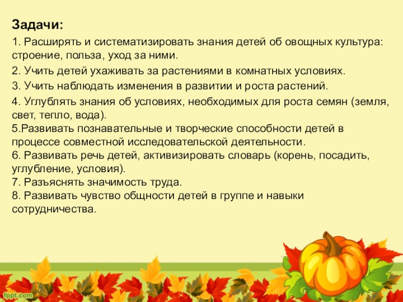 Задачи: 1. Расширять и систематизировать знания детей об овощных культура: строение, польза, уход за ними.2. Учить детей