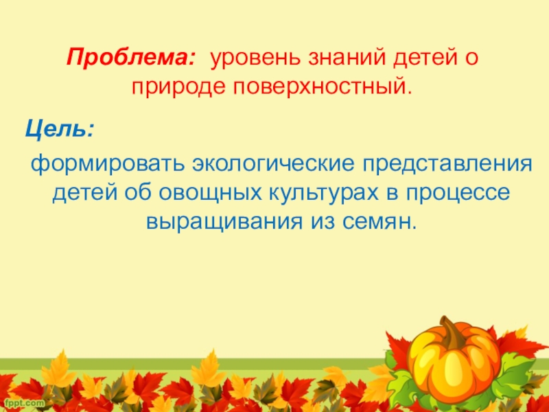Проблема: уровень знаний детей о природе поверхностный.Цель: формировать экологические представления детей об овощных культурах в процессе выращивания