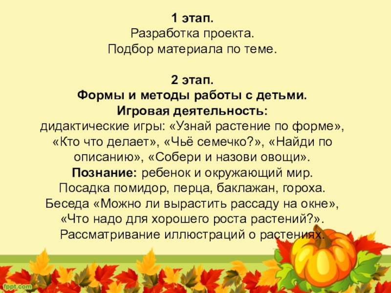 1 этап. Разработка проекта. Подбор материала по теме. 2 этап.Формы и методы работы с детьми. Игровая деятельность: дидактические игры: «Узнай растение по форме», «Кто что делает», «Чьё семечко?», «Найди по описанию», «Собери и назови овощи».