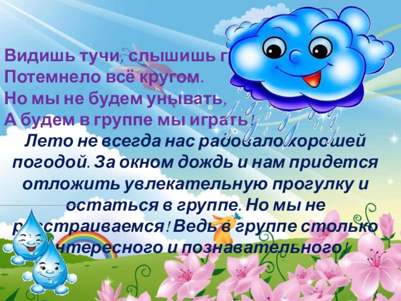 Видишь тучи, слышишь гром?Потемнело всё кругом.Но мы не будем унывать,А будем в группе мы играть!Лето не всегда