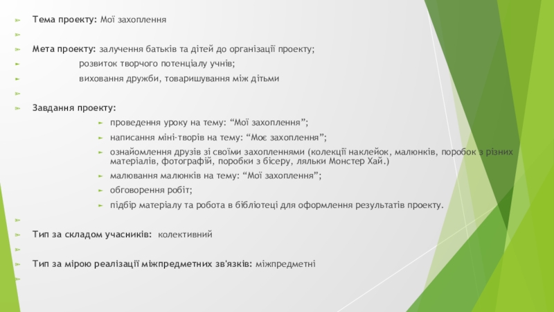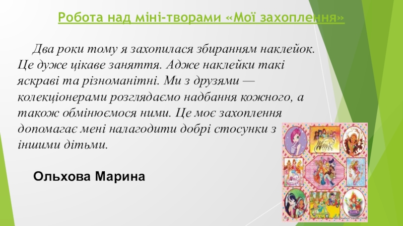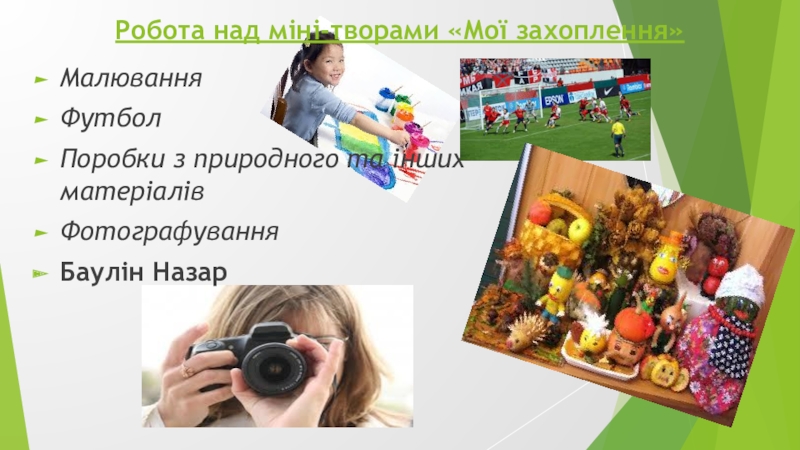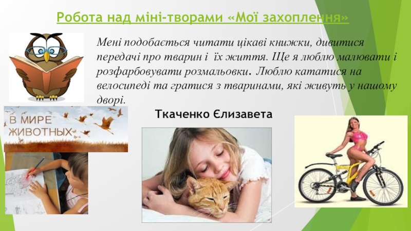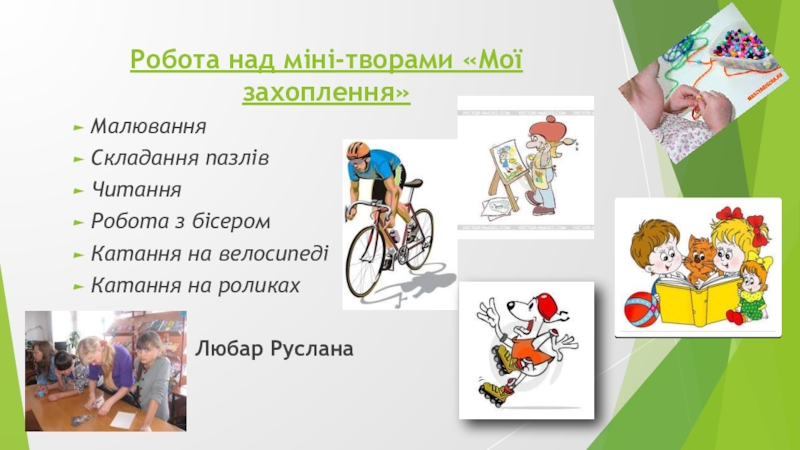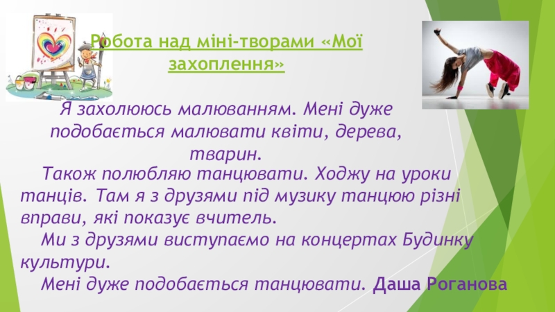 Також полюбляю танцювати. Ходжу на уроки танців. Там я з друзями під музику танцюю різні вправи, які показує вчитель.