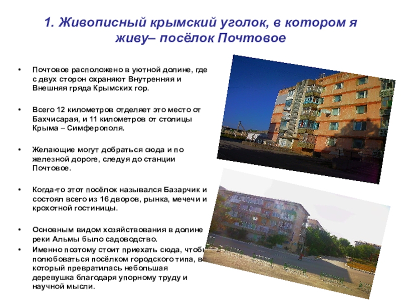 Почтовое расположено в уютной долине, где с двух сторон охраняют Внутренняя и Внешняя гряда Крымских гор.