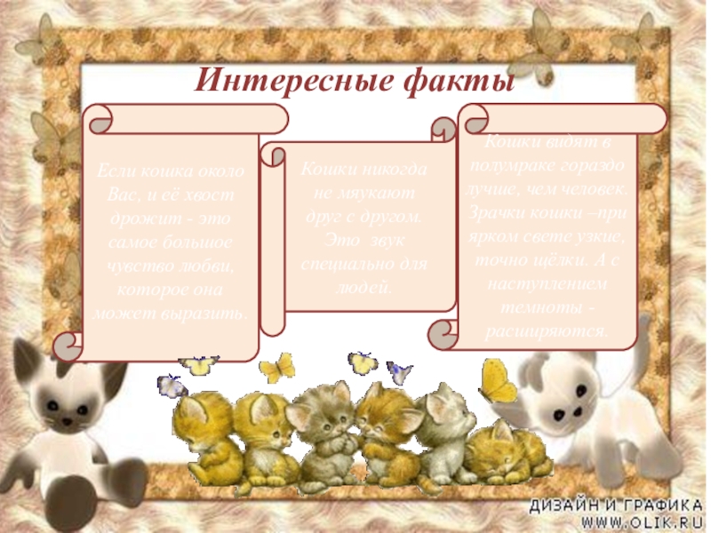 Кошки видят в полумраке гораздо лучше, чем человек. Зрачки кошки –при ярком свете узкие, точно щёлки. А с наступлением темноты - расширяются.