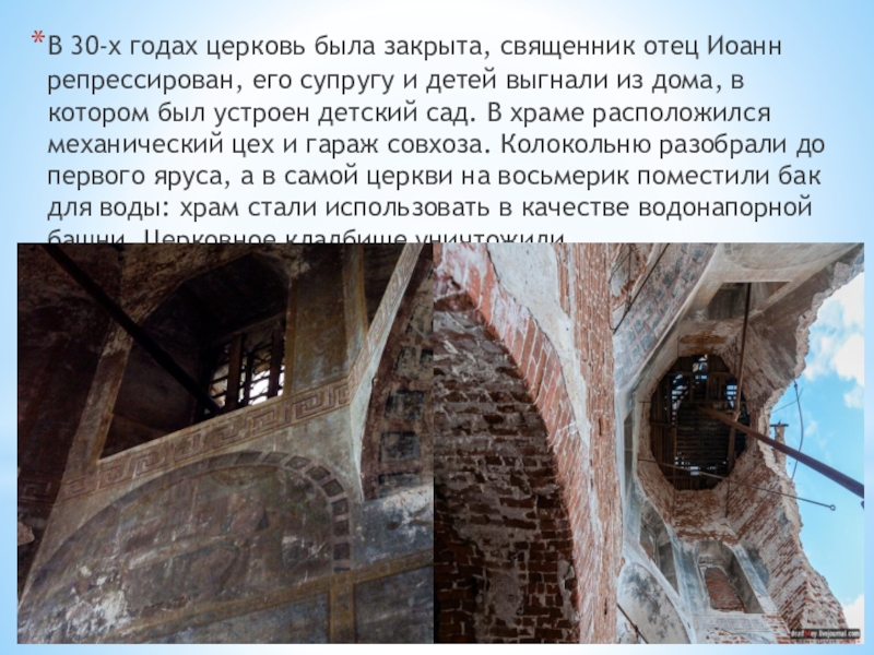 В 30-х годах церковь была закрыта, священник отец Иоанн репрессирован, его