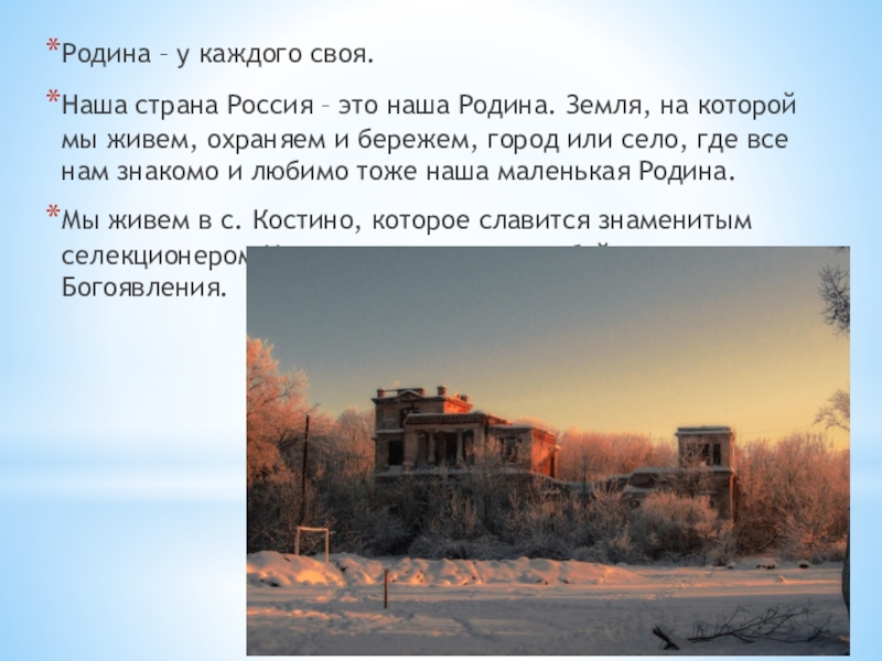 Мы живем в с. Костино, которое славится знаменитым селекционером Никитинским, его усадьбой и церковью Богоявления.