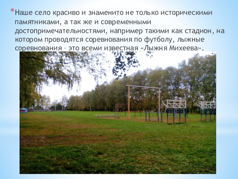 же и современными достопримечательностями, например такими как стадион, на котором проводятся соревнования по футболу, лыжные соревнования – это всеми известная «Лыжня Михеева».