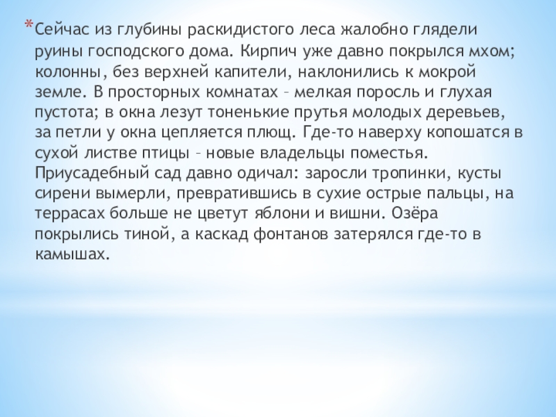 Кирпич уже давно покрылся мхом; колонны, без верхней капители, наклонились к мокрой земле. В просторных комнатах – мелкая поросль и глухая пустота; в окна лезут тоненькие прутья молодых деревьев, за петли у окна цепляется плющ. Где-то наверху копошатся в сухой листве птицы – новые владельцы поместья. Приусадебный сад давно одичал: заросли тропинки, кусты сирени вымерли, превратившись в сухие острые пальцы, на террасах больше не цветут яблони и вишни. Озёра покрылись тиной, а каскад фонтанов затерялся где-то в камышах.