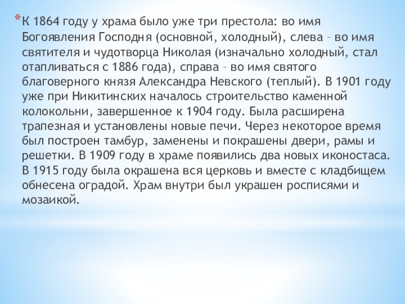 Богоявления Господня (основной, холодный), слева – во имя святителя и чудотворца Николая (изначально холодный, стал отапливаться с 1886 года), справа – во имя святого благоверного князя Александра Невского (теплый). В 1901 году уже при Никитинских началось строительство каменной колокольни, завершенное к 1904 году. Была расширена трапезная и установлены новые печи. Через некоторое время был построен тамбур, заменены и покрашены двери, рамы и решетки. В 1909 году в храме появились два новых иконостаса. В 1915 году была окрашена вся церковь и вместе с кладбищем обнесена оградой. Храм внутри был украшен росписями и мозаикой.