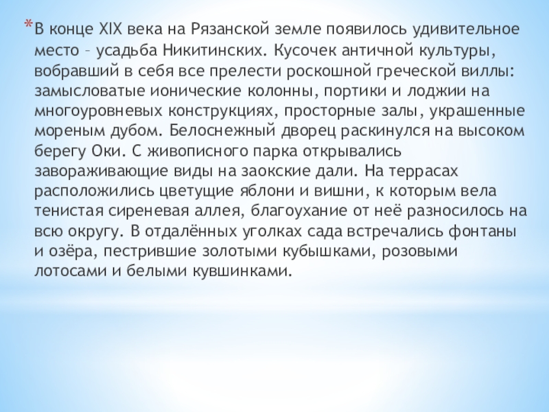 усадьба Никитинских. Кусочек античной культуры, вобравший в себя все прелести роскошной греческой виллы: замысловатые ионические колонны, портики и лоджии на многоуровневых конструкциях, просторные залы, украшенные мореным дубом. Белоснежный дворец раскинулся на высоком берегу Оки. С живописного парка открывались завораживающие виды на заокские дали. На террасах расположились цветущие яблони и вишни, к которым вела тенистая сиреневая аллея, благоухание от неё разносилось на всю округу. В отдалённых уголках сада встречались фонтаны и озёра, пестрившие золотыми кубышками, розовыми лотосами и белыми кувшинками.