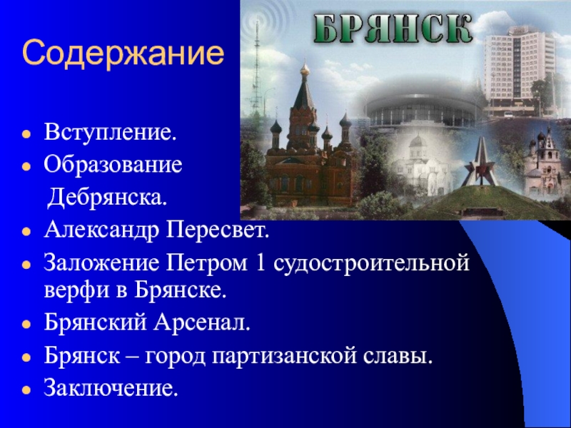 Содержание Вступление.Образование   Дебрянска.Александр Пересвет.Заложение Петром 1 судостроительной верфи в Брянске.Брянский Арсенал.Брянск – город партизанской славы.Заключение.