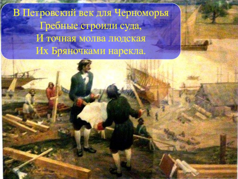 В Петровский век для Черноморья Гребные строили суда, И точная молва людскаяИх Бряночками нарекла.
