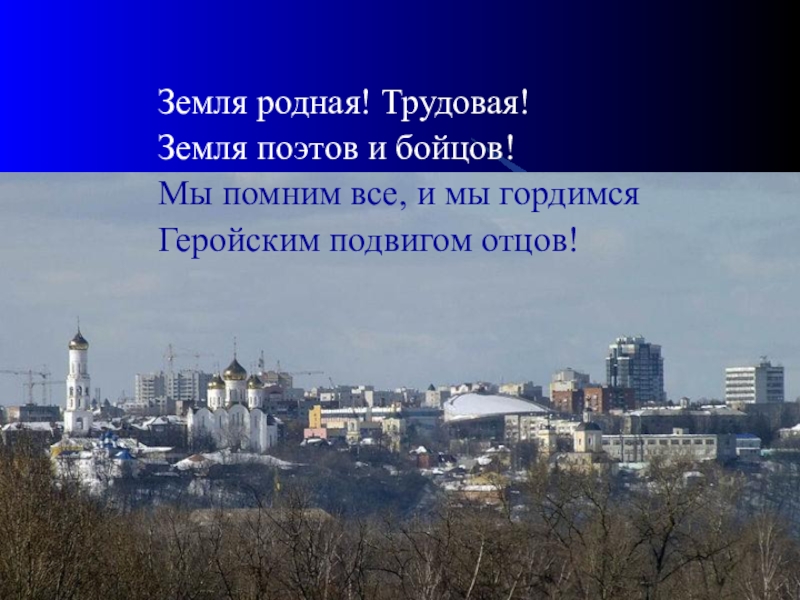 Земля родная! Трудовая!Земля поэтов и бойцов!Мы помним все, и мы гордимсяГеройским подвигом отцов!
