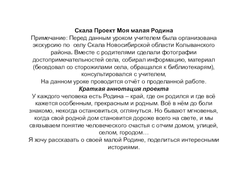 экскурсию по селу Скала Новосибирской области Колыванского района. Вместе с родителями сделали фотографии достопримечательностей села, собирал информацию, материал (беседовал со сторожилами села, обращался к библиотекарям), консультировался с учителем,