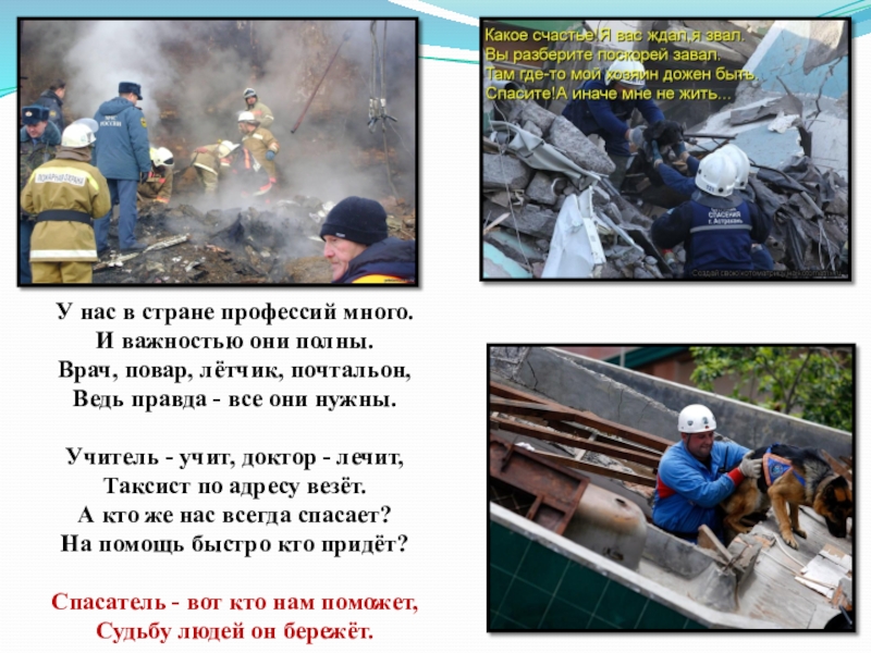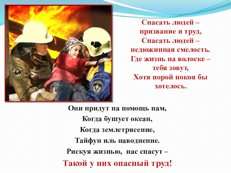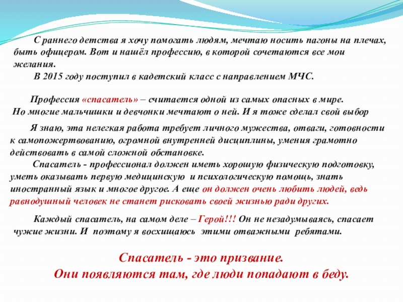 Спасатель - профессионал должен иметь хорошую физическую подготовку, уметь оказывать первую медицинскую и психологическую помощь, знать иностранный язык и многое другое. А еще он должен очень любить людей, ведь равнодушный человек не станет рисковать своей жизнью ради других.